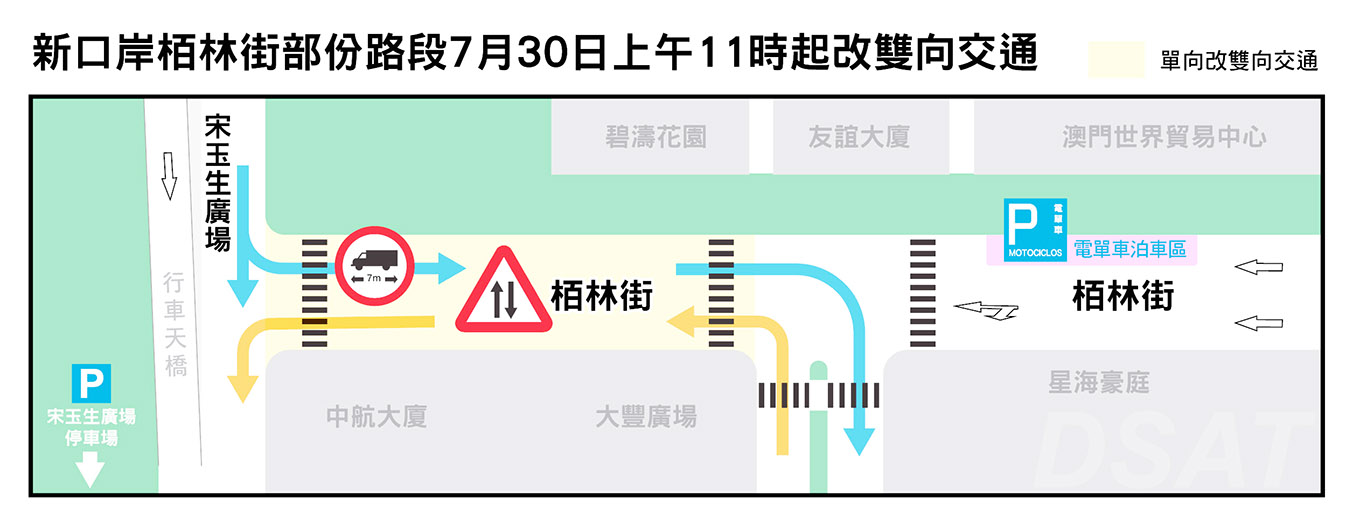【特訊】交通事務局現正於新口岸分階段進行交通整治工程,當中栢林街的工程將會竣工。7月30日(周五)上午11時起,宋玉生廣場與馬時濟總督大馬路之間的一段栢林街會由原來的單向行車調整為雙向行車,同時禁止長度超過7米之車輛由宋玉生廣場轉入栢林街。