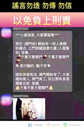 【特訊】近日司法警察局再次發現網絡社交平台上流傳一則消息,稱本澳出現有人身穿防護衣物並按大廈住戶的門鈴,要求進入單位為市民進行消毒工作,懷疑是假冒防疫人員欲行騙或實施其他犯罪。