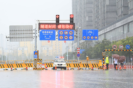 記者在鄭州市京廣北路隧道看到,已封閉的隧道入口內側被擋水板、防汛沙袋堵住,外側有警戒護欄、伸縮護欄等,附近還有應急車輛、救生艇等。
