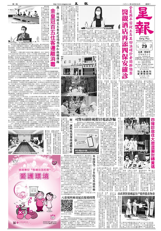 與此同時,社會工作局、衛生局與民間社會服務機構(澳門紅十字會、澳門明愛、澳門街坊總會及澳門婦聯總會)組成19支社區外展隊(上門核檢小隊),正為居家屬難於行動以至未能出門的人士進行外展核酸檢測。社會工作局24小時心理支援熱線28261126接獲的求助電話中,經聯絡及確認,在社區上居住屬難於行動的人士(如:身患嚴重疾病、長期卧床),現階段有309人。19支社區外展隊(上門核檢小隊)會先致電聯絡上述人士及表明所屬的工作部門,到戶時會穿著部門制服及出示工作證以作識別,預計於9月28日可完成上述社區外展核酸檢測工作。