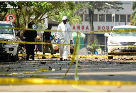 烏干達警方發言人埃南加16日表示,當天上午坎帕拉中央警察局附近、議會大樓附近連續發生兩次爆炸,後經調查證實,爆炸系3名襲擊者實施的自殺式炸彈襲擊。埃南加稱,一名襲擊者在警察局附近引爆炸彈,當場造成2人死亡。不到三分鐘後,另外兩名騎摩托的襲擊者引爆炸彈後又造成1人死亡。當地警方隨後逮捕了另一名疑似自殺式炸彈襲擊者並解除了他的武裝,成功阻止可能的第三次襲擊。截至目前,此次事件已造成包括3名襲擊者在內的6人死亡、33人受傷。