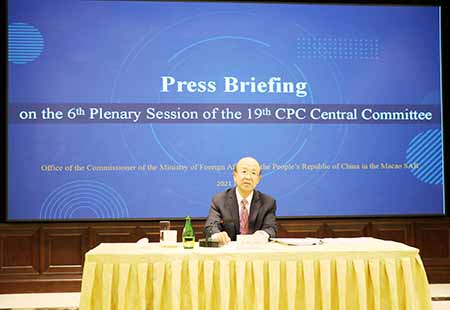 【特訊】十一月廿六日,外交部駐澳門公署舉行中共中央十九屆六中全會精神對外吹風會,劉顯法特派員全面、系統、深入介紹了全會精神,並回答記者提問。莫桑比克、安哥拉、菲律賓駐澳門總領事,葡萄牙駐澳門副領事,中葡論壇常設秘書處副秘書長贊東及葡語國家派駐代表,澳廣視葡文部、盧薩社澳門分社及《澳門郵報》《澳門每日時報》《澳門論壇日報》《今日澳門報》《句號報》《澳門平臺報》《澳門商業雜志》等特區英葡文媒體負責人近三十人出席。
