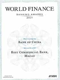 澳門中銀連續第三年榮獲《World Finance》頒發的年度“澳門地區最佳商業銀行”獎項,體現了對澳門中銀整體經營成果的充分肯定。2021年,面對疫情下的困難環境,澳門中銀在保障金融秩序穩定、支持經濟民生的同時,全力推動現代金融的發展,支持橫琴粵澳深度合作區建設。