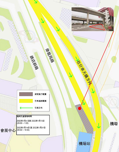 (2) 2022年1月4日至1月13日,每晚8時至翌日凌晨1時及2022年1月14日至1月31日每日上午9時半至下午4時,鄰近機場的一段偉龍馬路實施有限度通車,往科大方向的車輛需行駛靠近澳門國際機場一側的上層或下層行車道,而道路最右側的行車線將臨時封閉。