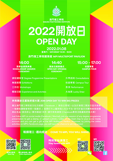 有關開放日的更多精彩活動,請瀏覽澳理工網站專頁:ipm.mo/openday、Facebook專頁或官方微信:ipmadmission。為配合防疫工作,參與者在活動期間必須配戴口罩、接受體溫探測,並出示當天有效之綠色【澳門健康碼】。