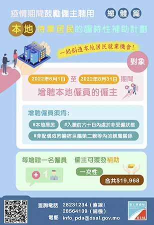 【特訊】為增加就業崗位,促進及穩定本地待業居民就業,勞工事務局於今年6月1日至8月31日期間推出《疫情期間鼓勵僱主聘用本地待業居民的臨時性補助計劃》,僱主每增聘一名本地待業居民,可獲一次性發放一萬九千九百六十八澳門元的補助款項,補助名額不設上限。