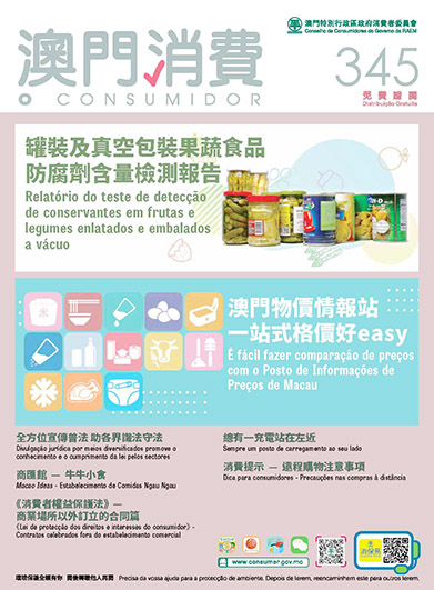 【特訊】消費者委員會及市政署食品安全廳聯合抽查罐裝及真空包裝果蔬食品防腐劑含量,20款樣本全部合格,檢測報告刊登於第345期《澳門消費》。新一期《澳門消費》介紹「澳門物價情報站」以及《消費者權益保護法》規範商業場所以外訂立的合同相關規定。