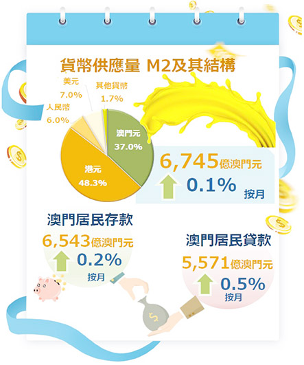 在貨幣供應方面,流通貨幣下跌2.4%,而活期存款則上升0.8%,M1因而較上月減少0.1%。另一方面,準貨幣負債增加0.1%,因此包括M1及準貨幣負債的廣義貨幣供應量M2遂按月回升0.1%,金額為6,745億澳門元。若與2021年同期比較,M1及M2分別下跌10.7%及4.1%。按幣種分析,澳門元、港元、人民幣及美元在M2的比重分別為37.0%、48.3%、6.0%及7.0%。