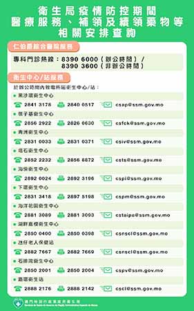 居民可在辦公時間內致電所屬衛生中心/站,了解相關的醫療服務、補領及續領藥物等相關安排,各衛生中心站的聯絡方式如下: