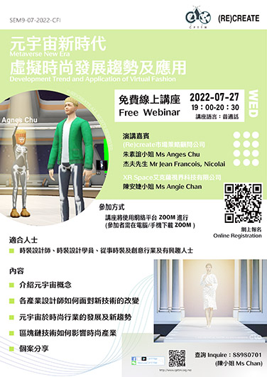 講座邀請到(RE) Create市場策略顧問公司朱素誼小姐,以及杰夫先生擔任主講嘉賓,他們將講解何謂元宇宙、時尚行業在元宇宙中的發展及新趨勢,同時探討區塊鏈技術如何影響產業,以及設計師如何面對新技術的改變。講座同時邀請了XR Space艾克薩視界科技有限公司的陳安婕小姐分享個案經驗,讓業界人士能了解元宇宙新趨勢及虛擬時裝技術等新興科技,思考如何藉此提升產值及競爭力。