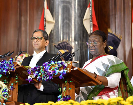 印度首席大法官拉馬納主持就職典禮。印度聯邦議會兩院議長、總理莫迪、部長會議成員、各邦邦長和首席部長等出席。