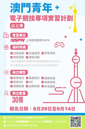 「澳門青年電子競技專項實習計劃」是由勞工局與橫琴民生局及內地著名電子競技企業英雄體育VSPN(下稱“英雄體育”)合作舉辦的在崗實訓計劃,由企業資深人員指導工作,培養澳門青年具備專業電競職業技能。實習崗位涉及賽事執行、導播助理、助理OB、市場運營、人力資源、品牌助理、項目執行、運營助理和項目助理等範疇,實習地點為上海市,為期3個月。