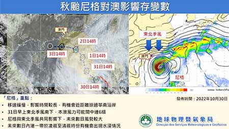 氣象局表示,熱帶氣旋尼格現時在本澳八百公里附近徘徊,預料隨後將緩慢向北移近華南沿岸,氣象局將於今日考慮發出熱帶氣旋信號。另外,受東北季風補充的影響,今早本澳風力可能間中達六級,預料週二至週四,在尼格與東北季風的共同影響下,本澳風勢將會增強,間中有驟雨。氣象局將密切監察該熱帶氣旋趨勢,呼籲市民留意最新天氣資訊。