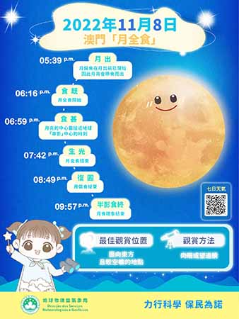 氣象局表示,澳門將於週二(八日)傍晚的上空上演「月全食」天文現象,屆時月球會呈不常見的銅紅色。當天雖有雲層,但市民仍能觀看到「月全食」部份過程,建議可面向東方且較空曠的地點,以肉眼或望遠鏡欣賞神秘的「紅月亮」。下一次澳門看到「月全食」,將會是將是二零二五年九月八日。