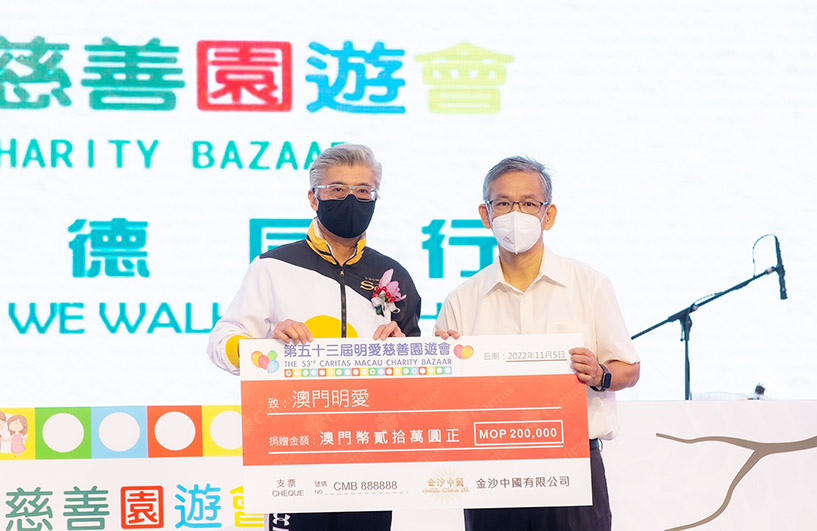 2022澳門明愛慈善跑;於10月30日,威尼斯人(澳門)股份有限公司企業傳訊及社會事務副總裁沈頌年於氹仔海濱休憩區舉行的支票捐贈儀式上,將澳門幣10萬元的善款交予澳門明愛總幹事潘志明,以支持「2022澳門明愛慈善跑」。在疫情不確定的因素下,為避免人群聚集,今年的明愛慈善跑繼續以線上形式舉行,參加者在指定時間內可自由選擇跑步地點,並利用跑步應用程式或跑步機記錄步數,再上傳照片參與線上跑。約40名金沙中國關懷大使及其家人出席了支票捐贈儀式,並身體力行一同參與線上跑。