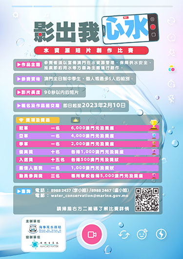 海事及水務局舉辦《影出我心水-水資源短片創作比賽》,讓學生製作與澳門水資源相關主題的宣傳短片。因應非高教學校於1月9日復課,比賽的收件日期亦延長至2023年2月10日,以便學生有更多時間發揮創意,將水資源的概念深入淺出地向社會宣傳普及,從而提高社會大眾對澳門節水和供水安全的關注。