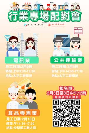 【特訊】勞工事務局表示,為舒緩業界人資需求壓力,並協助有求職需求的澳門居民盡快就業,勞工事務局與澳門工會聯合總會合作,2月9日至10日舉辦3場行業專場配對會,合共提供167個職位空缺。