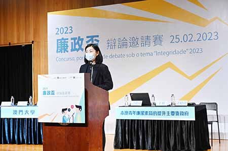 【特訊】廉政公署於2月25日下午假澳門大學學生活動中心劇院舉辦2023“廉政盃"辯論邀請賽,廉署助理專員歐陽湘表示,青年是構建廉潔社會的重要一環,更是續寫“一國兩制"新篇章的主體,她鼓勵青年積極參與建設廉潔社會,助力延續廉潔文化。