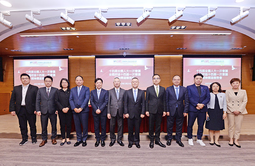 【特訊】澳門金融界慶委會24日下午於中國銀行大廈3樓會議廳舉辦全國十四屆全國人大一次會議、全國政協十四届一次會議精神傳達報告會。活動邀請澳區全國人大代表崔世平和蕭志偉、澳區全國政協常委何潤生以及澳區全國政協委員葉兆佳擔任主講嘉賓,向逾百名金融界代表傳達全國「兩會」精神。