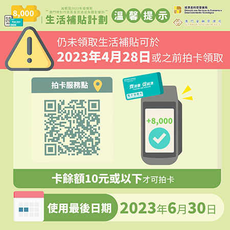 【特訊】“生活補貼計劃”的最後拍卡領取日為2023年4月28日,呼籲仍未領取8,000元生活補貼的居民,於領取期屆滿前拍卡領取。