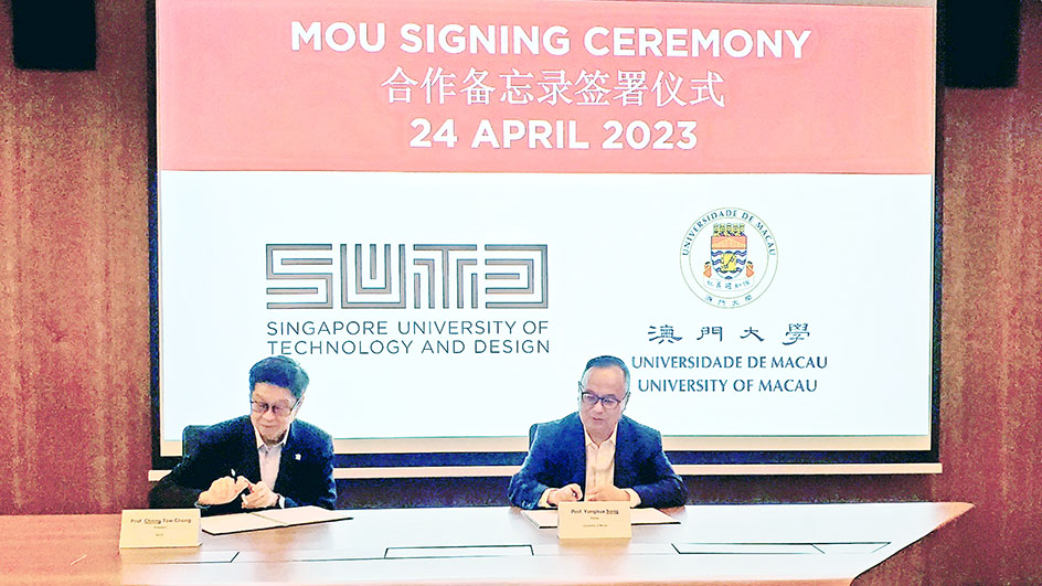 其後,代表團訪問了新加坡科技設計大學,宋永華與該校校長張道昌代表簽署合作備忘錄。兩校將有序開展教學及研究合作項目、師生交流計劃、共同舉辦學術研討會、共享學術資源等。儀式後,兩校就推進上述合作項目及進一步的合作計劃交換意見;雙方期望在合作備忘錄的基礎上,開展學生交換計劃以及重點科研領域的深入合作。宋永華表示,兩校之間的合作將會雙贏,不僅能夠促進學術交流和合作,還能夠為師生提供更廣闊的學習和發展機會。張道昌指出,備忘錄的簽署將有助推動國際學術交流和創新,共同培養具有創新思維和國際視野的人才。代表團亦前往 Dyson-SUTD Innovation Studios 和 Fab Lab,進一步了解新加坡科技設計大學最新的科創發展。