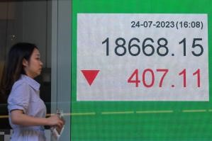 【新華社香港7月24日電】香港恆生指數24日跌407.11點,跌幅2.13%,收報18668.15點。全日主機板成交935.03億港元。