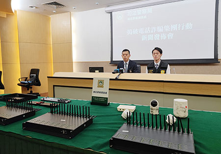 司警早前接獲三百多名居民舉報,指曾收到假冒本地銀行、政府部門的詐騙電話,於上月二十五日,本澳某電訊公司向司警檢舉,發現多張該公司的預付電話卡,作出不尋常頻繁撥號,本月四日,司警再收到本澳兩間銀行檢舉,表示其客戶收到假冒該行職員的詐騙電話,經調查鎖定目標,本月九日氹仔某單位破獲一個「數據中心」,起出三套正在運作的GOIP通訊設備、路由器及監控鏡頭等。