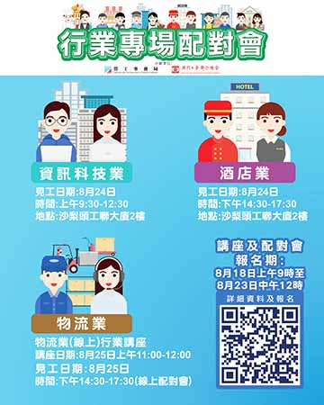 8月25上午舉辦物流業行業講座,講座以線上方式舉行,由國內知名企業“京東物流”人力資源總監主講,報名日期為8月18日上午9時至8月23日中午12時。8月25日下午舉辦物流業配對會,提供15個職位空缺,涉及運作主管、倉管員、快遞員及派送司機等。配對會以線上方式舉行。