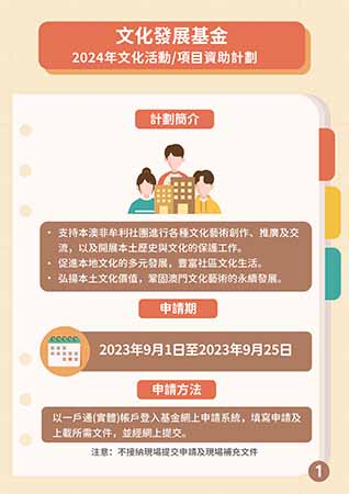 “2024年文化活動/項目資助計劃”支持本地依法成立的非牟利社團開展各種文藝創作及推廣工作、本土歷史與文化的保護工作,以及本地文化藝術交流。申請期由9月1至9月25日,資助範疇包括:視覺藝術、文學創作、音樂、曲藝(一般對唱、折子戲,形式僅限於演出)及文娛活動(金曲、流行曲,形式僅限於演出)、戲劇、舞蹈、物質及非物質文化遺產(包括粵劇長劇演出)、時裝、設計、影視及動漫相關活動和項目。過往的“跨年度資助計劃”亦整合至年度計劃中,活動/項目的執行期可申請1年或2年。申請人須以“一戶通”(實體)帳戶登入基金網上申請系統,填寫申請及上載所需文件,並經網上提交。文化發展基金提醒有意申請資助但未開立“一戶通”(實體)帳戶的社團,應儘早到行政公職局辦理相關的開戶手續以啟動帳戶。在申請資料齊全且符合條件的情況下,行政公職局將於翌日起計15個工作天內回覆開戶申請結果。