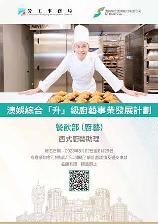 【特訊】為進一步推動澳門作為“創意城巿美食之都”,培養本地餐飲廚藝人才,勞工事務局和澳娛綜合度假股份有限公司合作推出“澳娛綜合「升」級廚藝事業發展計劃",以“先入職、後培訓”方式,協助符合條件和有意從事餐飲廚藝事業發展的澳門居民就業,計劃由8月22日至29日接受申請。