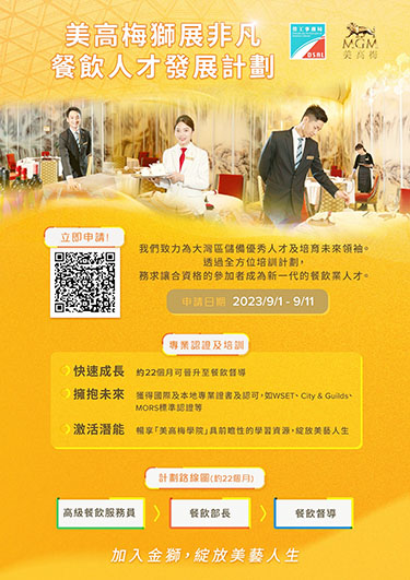 【特訊】為進一步培育本地餐飲服務人才,並提供發展階梯,勞工事務局和美高梅金殿超濠股份有限公司(下稱“美高梅")合作推出“美高梅獅展非凡餐飲人才發展計劃"(下稱“計劃"),以“先入職、後培訓”方式,協助符合條件和有意從事餐飲服務業的澳門居民就業,計劃由9月1日起接受申請。