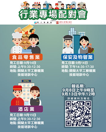 9月14日上午舉辦食品零售業配對會,提供59個職位空缺,涉及副店長、製餅師傅、店務員及包裝員等。同日下午舉辦物管及保安業配對會,提供143個職位空缺,涉及監控中心(指揮員)、監控中心(稽查員)、監控設備操作員、監控設備控制技術員(維修員)、排班員及保安員。