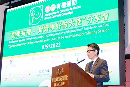 「澳門有禮運動:開學有禮 ─ 齊齊學好做大使」分享會由旅遊局主辦,澳門中華教育會、澳門天主教學校聯會、澳門公職教育協會協辦,支持單位包括澳門大學、澳門旅遊學院、澳門理工大學、澳門保安部隊高等學校、澳門城市大學、聖若瑟大學、澳門鏡湖護理學院、澳門科技大學、澳門管理學院和中西創新學院。