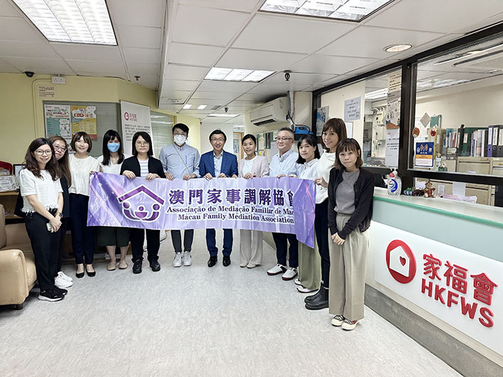 一行其後分別到香港家庭福利會親籽薈共享親職支援中心及調解中心進行參觀及交流,過程中除參觀機構外,更互相分享及交流家事調解的服務心得。該會期望透過了解香港家事調解的服務,有助未來在澳門推動家事調解的服務發展,讓大眾關注離異家庭中子女的福祉以及發掘潛在有需要的家庭,從而減低兒童因家庭衝突所帶來的傷害。