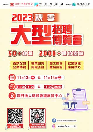【特訊】為著力拓寬就業渠道,進一步促進居民就業,勞工事務局與澳門工會聯合總會於11月13日及14日假澳門漁人碼頭會議展覽中心合辦「2023秋季大型招聘博覽會」,有意參加者可於11月10日中午12時前網上預約入場,報名情況踴躍,把握機會報名,名額有限,欲報從速。