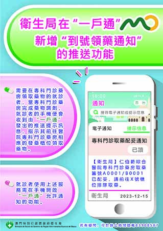 【特訊】衛生局表示,為配合特區政府電子政務發展,推動智慧醫療,優化就診者領藥服務體驗,衛生局仁伯爵綜合醫院專科門診藥房在“一戶通”新增“到號領藥通知”的推送功能,具體如下: