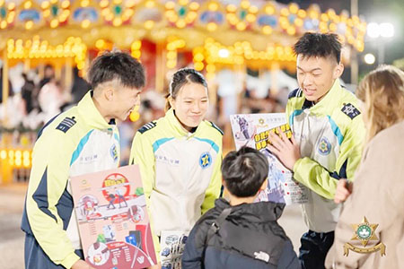 治安警察局人員帶領少年團一同向現場市民和遊客傳遞防罪資訊,提醒市民和遊客在人多擠逼的地方或參加慶祝活動時,要時刻保持對個人財物的警覺;在外出旅遊前,務必注意妥善保管貴重物品,確保門窗鎖好;使用手機時,切勿輕信不明短信、網站鏈接或隨意掃描二維碼,尤其要求輸入個人賬戶、財務或信用卡信息的請求,應格外警惕,並仔細核對網站真實性;在交通安全方面,宣傳行人及駕駛者應留意路面情況,遵守交通規則;行人應使用行人過路設施橫過車行道,尤其宣傳參與聚會後切勿酒後駕駛。