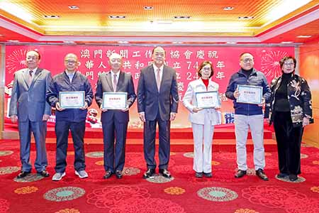 澳門新聞工作者協會昨晚舉辦會慶暨會員服務年資頒獎禮,共三百一十四人獲頒各級服務年資獎,行政長官賀一誠出席活動,並向服務年資滿五十五年的新聞工作者頒發終身服務獎,獲獎者分別是施慶筑、區蕙香、陸波和胡應勤。