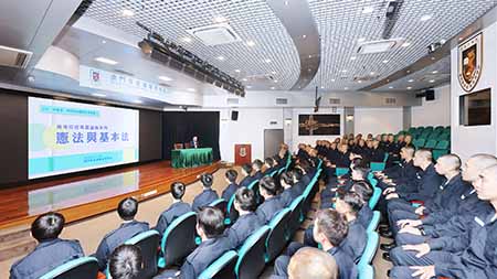 【特訊】法務局與澳門保安部隊高等學校於1月11日合辦本年首場「高等院校《憲法》與《基本法》專題系列活動」,邀請了澳門大學憲法與基本法研究中心主任蔣朝陽教授擔任主講,共89名澳門海關保安學員參與。適逢今年澳門回歸祖國25周年,蔣朝陽教授於講座上為學員們介紹澳門的歷史發展以及「一國兩制」在澳門成功實踐的情況,並講解《憲法》和《基本法》,以及第20/2023號法律《修改〈行政長官選舉法〉》的重點內容。講座後接續舉行「國是茶聊」小型討論會,蔣教授與學員們以輕鬆、互動的方式,就講座內容以及相關法律問題進行交流。為持續向本澳各界深入推廣《憲法》與《基本法》,自2015年起,法務局分別與多所高等院校合辦《憲法》與《基本法》專題系列活動,讓學生可全面和準確地理解《憲法》和《基本法》,成效顯著。未來,法務局將繼續舉辦不同類型的普法活動,加深市民對《憲法》、《基本法》,以及其他澳門法律法規的認識。