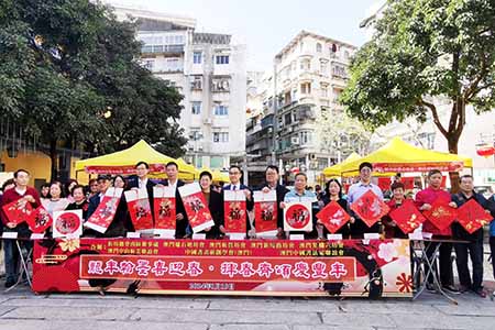 由澳門中國書法家聯誼會、中國書畫研創協會、果欄六坊會、板營坊會、新馬路坊會、爐石塘坊會、澳門中山板芙聯誼會和街坊總會南區辦事處於昨日下午二時半在康公廟前地舉辦「龍年幹墨喜迎春 揮春齊頌慶豐年」活動,向市民免費派逾千張揮春。