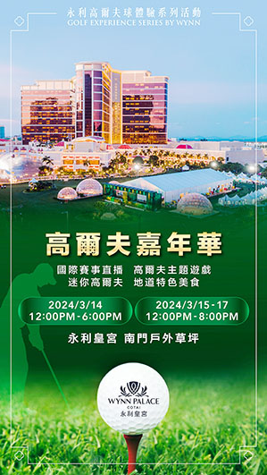 由永利呈獻的國際系列賽澳門站標誌著澳門迎來了國際系列賽的首秀。 國際系列賽是亞巡賽透過 LIV 高爾夫投入 3 億美元投資而引進的頂級系列賽事,可謂前所未有,備受矚目的國際系列賽澳門站將吸引頂尖的 LIV 高爾夫球手、大滿貫冠軍們等明星參賽。除了讓高爾夫天才球手們有大展身手的平台,賽事週期間,永利皇宮南門戶外草坪的「高爾夫嘉年華」將舉辦一系列精彩活動,包括國際賽事直播、高爾夫主題遊戲、迷你高爾夫等,所有活動免費向公眾開放。除了高爾夫主題活動以外,賓客還可於草坪上品嚐各種地道特色美食,享受戶外休閒時光。