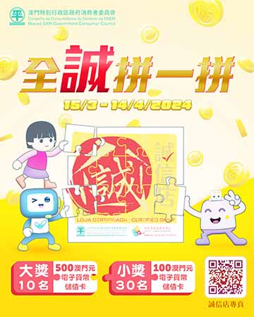 由3月15日起,消委會舉辦為期一個月的“全誠拼一拼”活動,活動設10名大獎及30名小獎,獎品分別為內附500澳門元及100澳門元的“誠信店”特別版電子貨幣儲值卡乙張,凡於該活動結束前年滿3歲,持有效澳門居民身份證的人士均具資格參加該網上拼圖遊戲。“全誠拼一拼”活動章程於同日上載到消委會網頁)https://www.consumer.gov.mo),歡迎居民踴躍參加。
