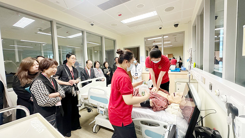 參觀過程中,鏡湖護院向中總代表團展示了為滿足現代護理教育需求而持續升級的教學設施,包括客觀結構化臨床考試中心於本年配置了視訊回饋暨中心管理系統,讓考試評核更客觀,提升專業技能考核的運作及管理效率和質量;模擬隔離病房、高仿真模擬教學設備和模擬長者家居環境場地,能訓練學生的綜合能力,提前接觸和適應臨床環境。代表團還參觀了由永利關愛基金會贊助的生命體驗館,加深了對護理專業及生命教育的認識。