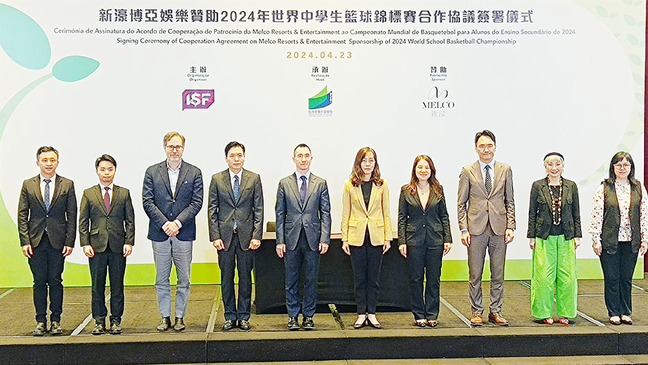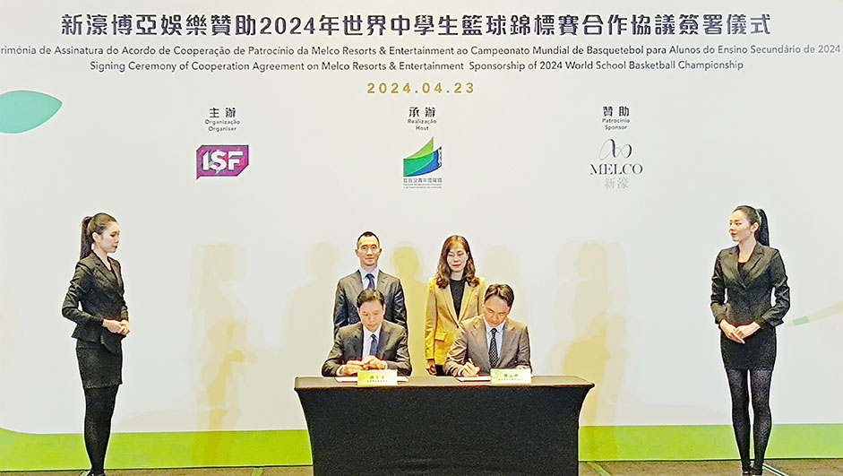在社會文化司司長歐陽瑜和新濠博亞娛樂主席兼行政總裁何猷龍的見證下,教青局局長龔志明與新濠博亞娛樂董事鍾玉文簽署贊助2024年世界中學生籃球錦標賽合作協議。龔志明致辭時表示,適逢2024年是中華人民共和國成立75周年及澳門回歸祖國25周年的雙慶之年,特區政府藉舉辦高水平的學生體育賽事,不但提供機會讓本澳學生與世界各地的學生在賽場上切磋及交流,而且有助對外推廣本澳的體育及旅遊事業,提升澳門在國際上的知名度。教青局與新濠在過往合作的基礎上,新濠贊助是次錦標賽部分經費是創新的合作模式,發揮企業的資源助力體育賽事活動的舉行,帶動綜合旅遊休閒產業與體育產業的協同發展,在社會文化司的統籌下,教青局亦正推動區域性學界活動、文旅研學及國際性學生體育賽事等,豐富澳門“教育+旅遊”的資源,開拓青年學生及其家庭客群的休閒旅遊新體驗。