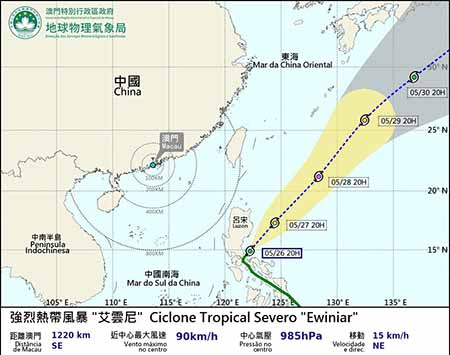 氣象局又提到,熱帶風暴「艾雲尼」昨日下午二時集結在菲律賓馬尼拉東南約 八十公里,以時速八公里向東北方向移動,暫時不會對本澳帶來直接影響。