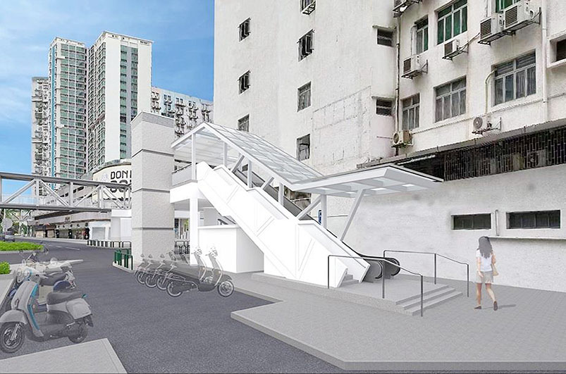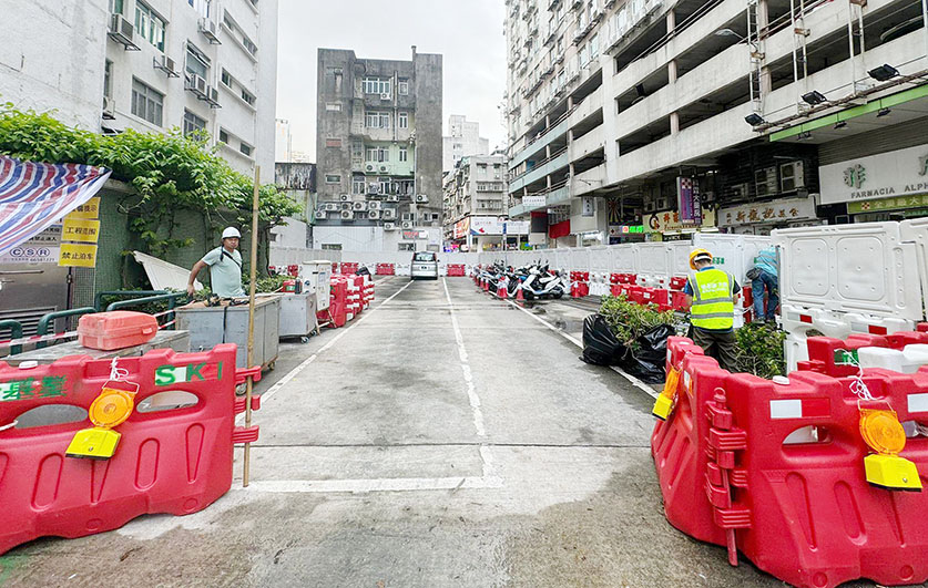 沙梨頭海邊大馬路行人天橋首期建造工程昨日 (二十五日) 展開,昨日早上約十時,在亞洲工業大廈一側的電單車停泊位及垃圾房已圍封,現場施工人員正拆除道路上花圃,附近交通順暢,車流不多。