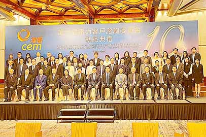 澳門電力股份有限公司於昨日晚上七時,在澳門美高梅宴會廳舉行第十屆電力客戶諮詢委員會就職典禮,在嘉賓見證下,環境保護局局長譚偉文及澳電執行委員會主席梁華權為新一屆委員會成員頒發聘書。梁華權表示,隨著多個大型發展項目的推進,本澳整體用電需求亦隨之上升。澳電一如既往以穩定的電力供應成為澳門向前發展的強力後盾,去年基於澳電責任的供電可靠度連續四年達至世界頂尖水平,整體客戶滿意度同創歷史新高至百份之九十一點七。
