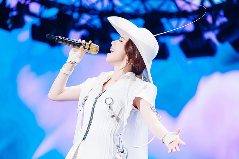 回顧澳門站的六場演出,是《I AM GLORIA》世巡首次於室內場館演出,共吸引了超過6 萬名觀眾,每一場都座無虛席。銀河綜藝館作為演出場地,以其先進的舞台設計和頂尖的科技手段為整場演出提供了完美的支持。主舞台採用了多層次立體設計,結合巨型LED 屏幕和動態投影技術,打造出一個充滿未來感的視聽空間。演唱會的燈光設計也極具藝術性,通過多變的燈光效果,營造出或夢幻或震撼的氛圍。