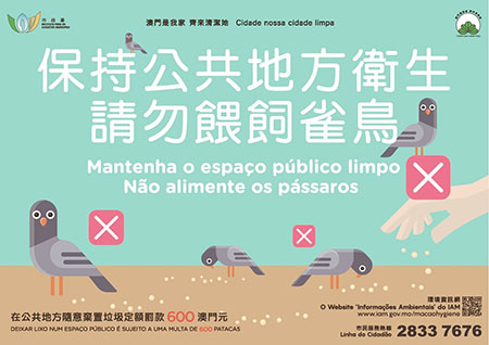 此外,巡查人員在金蓮花廣場發現大量餵飼野鳥的麵包碎,為保持公共地方整潔衛生,市政署將加強巡查執法,呼籲市民及遊客切勿餵飼雀鳥,違反有關規定可被罰款六百澳門元。