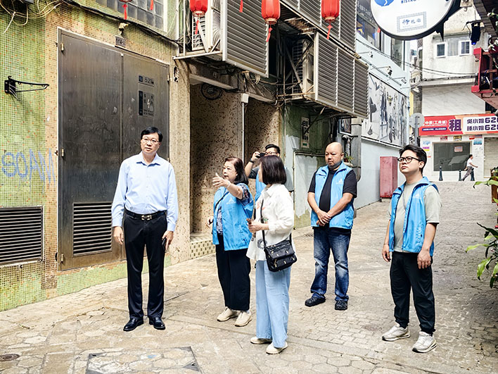 【特訊】日前,立法會議員梁鴻細、板營坊會會長鄒金玉及理事長原勁滔、街總南區辦事處主任曾家樺一行到板障堂街和天神巷一帶巡區,收集居民意見,並呼籲當局維護好區內衛生狀況,增設拍照打卡點,優化市民和遊客的出行體驗。
